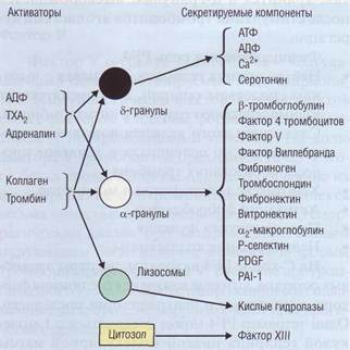 Рис. 21. Секретируемые факторы тромбоцитов присутствуют в тромбоцитах в 3 видах гранул хранения. Разные стимуляторы приводят к освобождению содержимого гранул тромбоцитов Тромбоциты