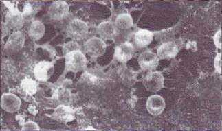 Образовавшийся фибриновый сгусток - трехмерная молекулярная сеть, в которую включены тромбоциты, эритроциты и лейкоциты (рис. 46). Активированные тромбоциты, связанные с нитями фибрина через рецепторы GPIIb-IIIa, сокращают-