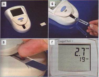 Рис. 65. Портативный прибор «CoaguCheck Plus» (фирма «Roche») для определения ПВ и АЧТВ: А - общий вид и картридж для программирования прибора, Б - тест-полоска вводится в прибор, В -капля капиллярной крови наносится непосредственно на тест-полоску, помещенную в прибор, Г - результат готов через несколько минут, причем данные по протромбиновому времени (ПВ) представляются сразу в единицах международного нормализованного отношения (MHO)