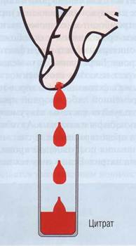 Рис. 66. При взятии крови в антикоагулянт не допускается стекание крови по коже пальца, по стенке пробирки и любой другой поверхности, так как мгновенно происходит контактная активация процесса свертывания. Кровь самотеком из прокола должна попадать прямо в антикоагулянт, перемешиваясь с ним