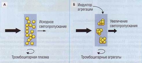 Агрегацию тромбоцитов исследуют на агре-гометре с использованием индукторов агрегации. Требования к пробам критичны. Исследование агрегации проводят на плазме, богатой тромбоцитами (ПБТ, английская аббревиатура PRP). Желательно использовать ПБТ, содержащую примерно 200 клеток/нл. Это требование затруд- няет оценку агрегации тромбоцитов при тромбо-цитопении. Пробы помещаются в кювету агрегометра, который представляет собой оптический прибор с регистрацией проходящего света. Проба в кювете постоянно перемешивается специальной мешалкой. При формировании агрегатов повыша- Обеспечение диагностики нарушений гемостаза в КДЛ