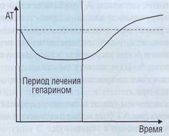 В клинико-диагностических лабораториях AT определяют иммунохимическими методами (ELISA, турбидиметрия, нефелометрия), тестами с хромогенными субстратами или коагуляцион-ными методами. Методом с хромогенным субстратом AT определяется через фактор Ха или Па при насыщающей концентрации гепарина. Принцип определения AT представлен на рис. 118. При выборе предпочтение отдают методу с использованием ф.Ха, так как он более стабилен и подвержен меньшим влияниям со стороны интерферирующих воздействий, чем тромбин (фактор На). Нормальный уровень активности AT в плазме взрослых колеблется в диапазоне 75-125%, этот диапазон практически одинаков при использовании разных тест-наборов. Дефицит AT - серьезный фактор риска развития венозных тромбозов. У новорожденных уровень AT составляет около 50% и достигает уровня взрослых к 6 мес. Небольшое снижение AT наблюдается в середине менструального цикла, в пред- и послеродовом периоде, при токсикозах второй половины беременности, в послеоперационном периоде. Эти сдвиги более выражены у пациентов с группой крови А (II), а также у пожилых. Снижение содержания (активности) А Т отмечается при: • врожденном (наследственном) дефиците или • заболеваниях печени (опухоли, цирроз, алко • нефротическом синдроме (протеинурия свы • карциноме легких; • ДВС-синдроме; • множественных травмах, тяжелых родах, по • приеме эстрогенов (пероральных контрацеп • лечении L-аспарагиназой; • многие протеазы, включая гранулоцитарную лечения гепарином. Длительная гепаринотера-пия может приводить к снижению активности AT в плазме. Лечение высокими дозами гепарина, особенно нефракционированным гепарином, приводит к транзиторному снижению AT по механизму потребления (рис. 119), особенно у больных с тяжелой патологией, в критических случаях, при ДВС-синдроме, сепсисе, злокачественных опухолях. Увеличение содержания (активности) А Т отмечается во время менструации, а также при: • остром вирусном гепатите; • холестазе; • приеме анаболических стероидов; • лечении пероральными (непрямыми) антико