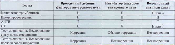 Изменения екрининговых тестов при врожденном дефиците факторов VIII и IX, наличии специфического ингибитора и волчаночном антикоагулянте