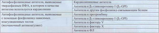 Для подтверждения диагноза волчаночного антикоагулянта необходимо провести подтверждаю- щие тесты, например тест нейтрализации на тромбоцитах. Проводится определение АЧТВ и активности факторов внутреннего пути плазмы больного до и после инкубации с тромбоцитами здорового донора или эритрофосфатидом. При наличии волчаночного антикоагулянта АЧТВ сокращается, а активность факторов возрастает за счет связывания части антифосфолипидных антител на тромбоцитах здорового человека. В группу подтверждающих внесены также индексы, основанные на сравнении результатов фосфолипид-зависимьгх и фосфолипид-не-зависимых тестов (лебетокс/эхитоксовый индекс). Для уточнения диагноза антифосфолипидно-го синдрома необходимо провести определение кардиолипиновых антител с использованием метода ELISA. В табл. 31 представлен перечень антифосфолипидных антител, которые выявляются ИФА и коагуляционным методом. Определение антифосфолипидных антител (АФА) АФА, выявляемые твердофазным ИФА, представляют собой различные комбинации иммуно-