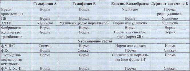 Диагностический алгоритм гемофилии представлен в табл. 39: • На первом этапе выполняются скрининговые тесты: время кровотечения, ПВ, АЧТВ, фибриноген, количество тромбоцитов.