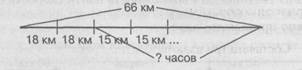 Чертеж показывает, что для нахождения расстояния нужно взять по 15 три раза: 15 • 3 = 45 (км). Совершая экскурсию по реке на катере, школьники проплыли 66 км. При этом 2 ч они плыли со скоростью 18 км/ч, а остальной путь — со скоростью 15 км/ч. Сколько всего времени находились в пути школьники? Если учитель планирует фронтальный разбор этой задачи, он может воспользоваться таблицей, которую заполняет в процессе разбора текста с детьми. Графическая модель к этой задаче является более наглядной и удобной для выполнения в тетради — по ней легко определить путь решения:
