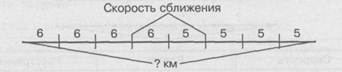 I. 1)5 -4 = 20 (км) И. 1)6 + 5 = 11 (км/ч) 2)6 + 4 - 24 (км) 2) 11-4 = 44 (км) 3)20 + 24 - 44 (км) При решении задачи вторым способом можно ввести термин «скорость сближения», разъяснив его по графической модели. Учитель может сдвигать одновременно навстречу друг другу фигурки пешеходов, каждый раз на одно деление. Это значит, что прошел 1 час пути. - На сколько приблизились (сблизились) друг к другу за 1 час пешеходы? (На5 + 6= 11 км/ч) Обращаем внимание детей на то, что складываются скорости, поэтому в наименовании ответа тоже скорость. Далее учащиеся рассуждают так: «За 1 ч пешеходы сблизились на 11 км; за 4 ч они сблизятся на 11 • 4 км». Работая с данной задачей, целесообразно использовать различные методические приемы и прежде всего рассмотреть задачи обратные данной. Их можно предложить в графическом виде, облегчающем детям самостоятельное составление обратной задачи: