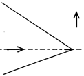 640. На рисунке показаны границы областей волнений, возбуждаемых кораблем на двух участках пути. Горизонтальными стрелками указаны направления скорости корабля. На первом участке течение отсутствует. Направление течения на втором участке показано вертикальной стрелкой. Определите скорость течения, если скорость корабля относительно берегов в обоих случаях одна и та же и равна 18 км/ч.