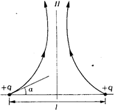 Ф946. Два одинаковых точечных заряда q > 0 находятся на расстоянии l друг от друга. На какое минимальное расстояние «подойдет» к плоскости симметрии П силовая линия, выходящая из левого заряда под углом a к прямой, соединяющей заряды? Под каким углом к плоскости симметрии будет расположена эта линия при удалении на большое расстояние от зарядов? В. А. Нахшин