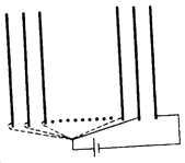 Ф967. Стопку очень тонких металлических пластин, находящихся на одинаковых расстояниях друг от друга, заряжают от батареи следующим образом. Отрицательную клемму батареи соединяют с самой правой пластиной, а положительную клемму присоединяют по очереди к самой левой пластине, затем ко второй слева, к третьей и т. д. до предпоследней (второй справа;). Найдите отношение заряда на самой правой пластине к заряду на третьей справа пластине. Считать, что толщина стопки много меньше, чем линейные размеры пластин. Е. П. Соколов