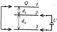 422. Половина сферического конденсатора заполнена диэлектриком с диэлектрической проницаемостью e. Найдите отношение плотностей зарядов на верхней и нижней половинах конденсатора и его ёмкость. 425. В пространство между пластинами незаряженного плоского конденсатора вносится металлическая пластина, имеющая заряд Q. Между пластиной и обкладками конденсатора при этом остаются зазоры l1 и l2. Площади всех пластин одинаковы и равны S. Определите разность потенциалов между обкладками конденсатора. 441. Между пластинами замкнутого плоского конденсатора находится точечный заряд q. Площадь пластин бесконечно велика, расстояние между ними равно d. Первоначально заряд находится на расстоянии d/3 от левой пластины. Какой заряд пройдет по проводнику, замыкающему пластины конденсатора, при перемещении заряда q в новое положение, при котором он будет находиться на расстоянии d/3 от правой пластины?
