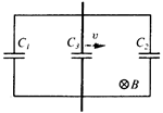 Ф1290. Между двумя параллельными шинами включены конденсаторы C1 и C2. Проводящая перемычка длиной L с конденсатором C3 касается шин. Перпендикулярно плоскости шин направлено однородное магнитное поле индукцией В. Перемычка движется с постоянной скоростью v. Найдите заряд на конденсаторе С3. Г. Федотович