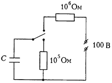 460. В схеме, изображенной на рисунке, переключатель все время переключается из верхнего положения в нижнее и обратно. В верхнем положении он задерживается на время t1 = 2×10-3 с, в нижнем — на время t2 = 10-3 с. Найдите мощность, потребляемую от источника, через очень большой промежуток времени после начала работы переключателя. Емкость конденсатора такова, что за время t2 он не успевает разрядиться сколь-нибудь существенно.