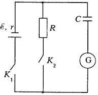 580. В схеме на рисунке ЭДС батареи 1, ее внутреннее сопротивление r, сопротивление резистора R. При замыкании ключа К1 стрелка гальванометра G отклоняется на угол a. На какой угол отклонится стрелка гальванометра, если при замкнутом ключе К1 замкнуть ключ К2? Отклонение стрелки пропорционально заряду, прошедшему через гальванометр.