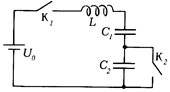 Ф1166. В схеме на рисунке замыкают ключ K1 (при замкнутом ключе K2), а в тот момент, когда заряд на конденсаторе С1 становится максимальным, ключ K2 размыкают. Найти максимальный заряд конденсатора C2. Параметры элементов схемы, указанные на рисунке, считать заданными. В. В. Можаев