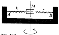 435. В установке, показанной на рисунке, муфта М прикреплена к двум одинаковым пружинам, жесткости которых k = 10 Н/м. Муфта без трения может скользить по горизонтальному стержню АВ. Установка вращается с постоянной угловой скоростью w = 4,4 рад/с вокруг вертикальной оси, проходящей через середину стержня. Найдите период малых колебаний муфты. Масса муфты М = 0,2 кг. При каком значении w колебаний муфты не будет?