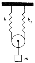 551. Груз массой m подвешен к двум пружинкам жесткостями k1 и k2 с помощью нити и блока. Найдите период малых колебаний груза. Нить и блок считать невесомыми.