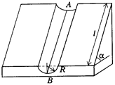717. Маленький шарик скользит без трения по цилиндрическому желобу радиусом R, ось которого наклонена под углом j к горизонту; длина желоба l. Сколько раз шарик пересечет линию AB, если он начал свое движение вблизи точки A?