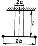 Ф1057. Гантель, состоящая из двух шариков массой m каждый, закрепленных на концах легкого стержня длиной 2b, подвешена в горизонтальном положении на двух нерастяжимых нитях длиной l, расстояние между которыми 2а. Найти период малых крутильных колебаний гантели. М. М. Цыпин