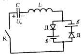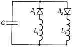 Ф800. Схема состоит из конденсатора емкости С, диодов Д1 и Д2, и катушек с индуктивностями L1 и L2 собранных, как показано на рисунке. Найти период колебаний напряжения на конденсаторе в этой схеме. Г. Л. Коткин, Г. В. Меледин