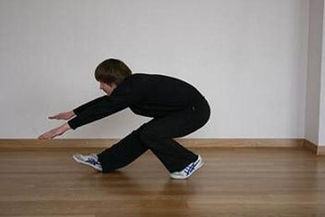 Упражнение 2. Исходная позиция: ноги на ширине плеч. Правая нога заступает за левую ногу. Левая рука тянется к полу. Опираясь на руку и правую ногу, добиваемся, чтобы сначала пола коснулась голень левой ноги, затем бедро и только потом сесть на пол. Поменять ногу. Левая нога заступает за правую. Далее повтор. Здесь важно, контролируя всё тело, последовательно опуститься сначала на голень, бедро и далее тазобедренный сустав. Фото 4