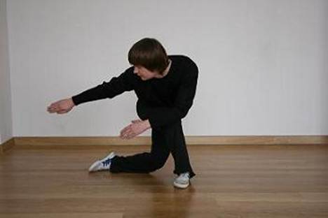 Упражнение 2. “Работа с импульсом”. Исходная позиция: нейтральная. Импульс (толчок), вынуждающий соответствующий участок тела двигаться в направлении от толчка. Пальцем кисти любой руки коснуться определенного участка своего тела – «задать импульс». Очень важно, чтобы тело мгновенно и «взрывно» отзывалось на это действие. Движение участка тела, получившего импульс, «гасится» до полной остановки. Это упражнение выполняется на трех уровнях: верхнем (стоя на ногах), среднем (положение приседа или полуприседа) и нижнем (на полу). Сценические падения. Подготовительные упражнения.