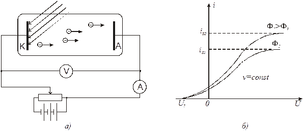 Электроны, вылетающие из катода, называются фотоэлектронами; во внешней цепи они создают фототок, возникающий при создании между катодом и анодом разности потенциалов U. Так как эмиссионная способность катода ограничена, то при некотором значении U фототок достигает значения насыщения Зависимость величины Так как фотоэлектроны вылетают с катода с некоторой отличной от нуля скоростью, то при