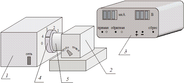 На передней панели объекта исследования находятся сетевой выключатель с индикатором включения сети. На боковой стенке расположено выходное окно осветителя и устройства для смены интерференционных светофильтров и регулировки освещенности. На боковых поверхностях усилителя фототока расположены соединительный шнур с разъемом для подключения объекта исследования к измерительному устройству и регуляторы баланса усилителя ГРУБО и ТОЧНО. Измерительное устройство (3) выполнено в виде конструктивно законченного изделия. В нем находятся устройства, позволяющие производить измерение тока фотоэлемента, установленного в объекте исследования, устанавливать и измерять питающие напряжения на фотоэлементе, а также осуществлять функции управления (установка режимов прямого или обратного измерения и т.п.). На передней панели измерительного устройства размещены следующие органы управления и индикации: 1) кнопка ПРЯМАЯ-ОБРАТНАЯ с соответствующими индикаторами – предназначена для включения прямого или обратного режимов измерения; 2) кнопки "+", "-" и СБРОС – предназначены для регулировки напряжения на фотоэлементе и его сброса в ноль; 3) индикаторы "В" и "мкА" – предназначены для индикации значений величин напряжения на фотоэлементе и фототока в процессе работы. На задней панели измерительного устройства расположены выключатель СЕТЬ, сетевой шнур с вилкой и разъем для подключения объекта исследования. Принцип действия установки основан на измерении тока через фотоэлемент при изменении полярности и величины приложенного к нему напряжения и изменения спектрального состава и величины освещенности катода фотоэлемента. В процессе выполнения лабораторных работ снимаются зависимости тока через фотоэлемент от приложенного к нему напряжения. При этом меняется полярность напряжения (то есть раздельно снимаются прямая и обратная ветви вольтамперной характеристики фотоэлемента). Характеристики снимаются при различных значениях освещенности и при изменении длины волны освещения фотоэлемента. По результатам измерений строятся семейства вольтамперных характеристик (ВАХ) и, используя соответствующие методы расчета, численно оценивается значение постоянной Планка. Date: 2015-05-19; view: 656; Нарушение авторских прав |