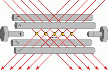 2. Використання в якості кубітів рівнів енергії іонів, захоплених іонними пастками, що створюються у вакуумі змінним електричним полем певної конфігурації в умовах лазерного охолоджування пасток до температур в декілька мікрокельвінів (див. рис. 8.4). Взаємодія між зарядженими іонами в одновимірному ланцюжку цих пасток здійснюється за допомогою збудження їх колективного руху, а індивідуальне управління ними — за допомогою лазерів інфрачервоного діапазону.