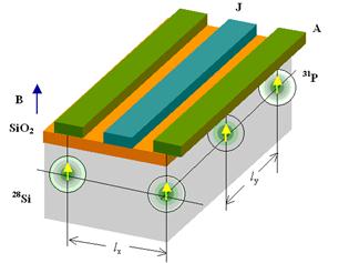 Автори дослідження використовували кремній з домішками атомів фосфору. Вчені сплутували спіни домішкових атомів фосфору і електронів. Значення спінів ядер атомів і електронів виступали в ролі кубітів. Кожний донорний атом з ядерним спіном - кубіт в напівпровідниковій структурі розміщувався регулярним чином з достатньою точністю під “своїм” управляючим металевим затвором (затвор A), відокремленим від поверхні кремнію тонким діелектриком (наприклад, окислом кремнію завтовшки порядку декількох нанометрів). Ці затвори утворюють лінійні решітки довільної довжини з періодом За допомогою електричного поля, що створюється потенціалом затворів A, можна змінювати розподіл електронної щільності поблизу ядра в основному стані змінюючи, відповідно, резонансну частоту кожного ядерного спіну, яка визначається надтонкою взаємодією його з електронним спіном. Це дозволяє здійснювати індивідуальне управління квантовими операціями шляхом селективної дії резонансних радіочастотних імпульсів на ядерні спіни певних донорів. Величиною непрямої взаємодії між ядерними спінами сусідніх донорів, яка забезпечує виконання двокубітних операцій, пропонується управляти за допомогою затворів J, розташованих між затворами A. Це можливо, якщо характерні розміри напівпровідникової структури знаходяться в нанометровій області. Охолодивши кремній з домішками фосфору до температури 3К і піддавши його дії радіо- та мікровипромінювання, вчені досягнули сплутування 10 мільярдів кубітів. Було підтверджено стан сплутаності з надійністю до 98 відсотків. Розвиток цього напряму, що визнається надзвичайно перспективним, визначається швидкістю розвитку нанотехнологічних розробок, необхідних для створення структур з потрібними параметрами. Крім вище означених і реалізованих існує також низка перспективних ідей: 1. Двомірний електронний кристал в потенціальній пастці (ямі) поблизу поверхні рідкого гелію. 2. Двомірна атомна решітка в оптичній пастці, утвореній стоячою хвилею інтерферуючих лазерних пучків. 3. Аніони в двомірному електронному газі в напівпровідниках в умовах дробового квантового ефекту Холла. 4. Квантові клітинні автомати у феромагнітних (антиферомагнітних) структурах в кристалах.