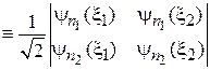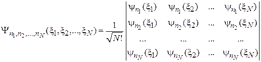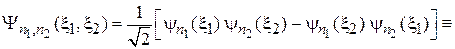 Определитель Слэтера. Для системы двух фермионов с перекрывающимися волновыми функциями, у одного из которых набор квантовых чисел n 1, а у другого – n 2, общая волновая функция антисимметричная