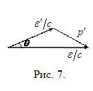 где k - волновое число. Фотон движется в направлении распространения электромагнитной волны. Эффект Комптона состоит в том, что при рассеянии рентгеновских лучей с длиной волны l о, в рассеянном излучении присутствуют не только l о, но и большие длины волн l >l о. Согласно классической теории при рассеянии не должно быть изменения длин волн. Опыты Комптона показали, что эффект является результатом взаимодействия падающих на вещество рентгеновских фотонов со «свободными», т.е. слабее всего связанными электронами атомов. При этом смещение длины волны D l = l - l о зависит только от угла рассеяния q и не зависит от рассеивающего вещества. Законы сохранения энергии и импульса (рис. 7) для взаимодействия рентгеновского кванта со свободным электроном имеют вид