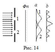 что ≈ длине волны рентгеновских лучей. Если размер приборов l~ 10 см, то l<<1, и волновые свойства пучка электронов в таких условиях не проявятся. Поэтому волновые свойства электронов стали искать на периодических структурах порядка межатомных расстояний, т.е. на кристаллических решетках. Так, в опыте Девиссона и Джермера (1927 г.) электроны отражались от поверхности монокристалла никеля (рис. 12) и затем попадали в цилиндр Фарадея (Ф), присоединенный к гальванометру. Большинство рассеянных электронов наблюдалось при угле j= 50о (и ускоряющем напряжении 54 В), указывающем на отражение от атомных плоскостей кристалла Ni, отстоящих друг от друга на расстояния длина волны, вычисленная по формуле (37), оказалась равной 0,167 нм. Совпадение этих значений является прямым доказательством гипотезы де Бройля.
