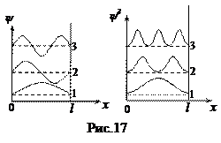 На рис. 17 представлены графики изменения волновой функции и квадрата ее модуля для первых трех значений n. Рассмотрим |ψ|2 для п= 2. Наибольшая вероятность обнаружить частицу имеем при x = l / 4 и x = 3 l / 4, однако при х = l/ 2 |ψ|2 = 0. Значит, в центре ямы и на её краях вероятность найти частицу близка к нулю (при n =2). Таким образом, частице в бесконечно глубокой яме нельзя приписать траекторию. Квантовый гармонический осциллятор. В квантовой теории понятие силы теряет смысл, поэтому квантовый гармонический осциллятор определим как поведение микрообъекта массы