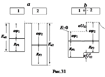 Контактная разность потенциалов. Термоэлектричество. Если два металла привести в соприкосновение, то при хорошем электрическом контакте между ними возникнет разность потенциалов, которую называют контактной. Рассмотрим графики потенциальной энергии двух металлов 1 и 2 до установления между ними контакта (рис. 31, а) и после (рис. 31, б). Пусть уровень Ферми в металле 1 лежит выше, чем в металле 2. Тогда при контакте электроны с верхних уровней 1 будут переходить на более низкие свободные уровни 2. При этом 1 зарядится положительно, а 2 – отрицательно, поэтому потенциальная энергия электронов в 1 уменьшается, а в 2 увеличивается. Условие равновесия при контакте - одинаковое положение уровней Ферми. При этом имеют место два скачка потенциала: 1 потенциальная энергия электронов вблизи 1 на