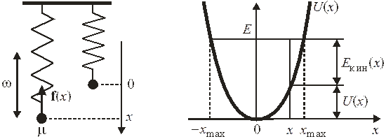 Гармонический осциллятор колеблется по гармоническому закону. В области применимости квантовой механики он имеет эквидистантный спектр энергии с не равной нулю минимальной энергией. Поэтому состоянию n сопоставляют n квантов энергии. Электромагнитное поле в резонаторе и в свободном пространстве, упругие колебания узлов кристалла, колебания атомов в молекуле рассматриваются как гармонические осцилляторы. Осциллятор в классической теории. При смещении x от положения равновесия тела массой μ потенциальная энергия и возвращающая упругая сила с коэффициентом жесткости κ равны