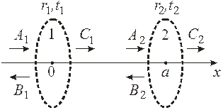 3. Рассеяние на локальных барьерах. Частица с волновым числом k проходит через барьеры 1 и 2 сосредоточенные при