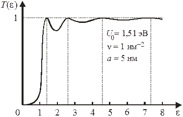 На рисунке показана зависимость коэффициента прохождения от энергии частицы для барьера шириной 5 нм, высотой 1,51 эВ.