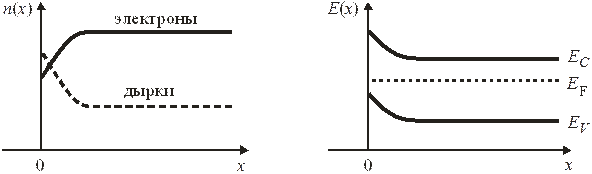 На рисунке показан полупроводник n -типа (число электронов существенно больше числа дырок) с поверхностными состояниями акцепторного типа, обогащающими поверхностный слой неосновными носителями – дырками. В результате изменяется работа выхода, размывается энергетический спектр, происходит рассеяние носителей тока, уменьшается длина свободного пробега и длина когерентности волны де Бройля. В микроэлектронике используются гетероструктуры с близкими кристаллографическими характеристиками, где одна кристаллическая решетка переходит в другую без образования открытой поверхности.