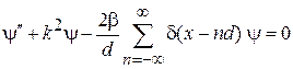 Одномерная решетка имеет узлы, создающие барьеры для электрона. Для неограниченной решетки из δ-образных барьеров