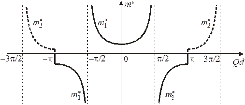 Если под действием внешней силы F квазиимпульс электрона увеличивается, приближаясь к границе зоны, то резко усиливается отраженная волна. Импульс, приходящий к электрону от решетки, направлен против F и имеет большую величину, поэтому ускорение направлено против силы и масса квазичастицы отрицательная. Около нижней границы второй зоны | Qd | = π из (3.86) получаем