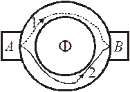 Интерференционные осцилляции сопротивления проводника с двумерным электронным газом при изменении магнитного поля экспериментально исследовали Юрий Васильевич и Дмитрий Юрьевич Шарвины в 1981 г. Использовалось кольцо из магния диаметром (1,5¸2) мкм. При температуре ~1К длина свободного пробега электронов превышает размер кольца. На платиновые контакты А и В подается напряжение. Через кольцо проходит магнитный поток Ф. На контакте А электронная волна разделяется и идет по путям 1 и 2, набирая фазы θ1 и θ2, и интерферирует на контакте В с разностью фаз