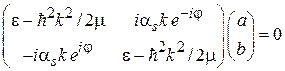 Определитель матрицы приравниваем нулю и получаем два решения для зависимости энергии электрона от волнового числа – закон дисперсии