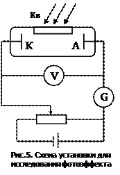 Это явление было открыто в 1887 году Г. Герцем, который заметил, что проскакивание искры между цинковыми шариками разрядника значительно облегчается, если один из шариков осветить ультрафиолетовыми лучами. В 1888-1889 гг. А.Г. Столетов установил следующие закономерности: 1) испускаемые под действием света заряды имеют отрицательный знак; 2) наибольшее действие оказывают ультрафиолетовые лучи; 3) величина испущенного телом заряда пропорциональна поглощенной им световой энергии. В 1898 году Ф. Ленард и Д. Томсон, измерив удельный заряд испускаемых под действием света частиц, установили, что эти частицы являются электронами. Схема установки для исследования фотоэффекта показана на рис.5. Свет проникает через кварцевое окошко Кв в эвакуированный баллон и освещает катод К, изготовленный из исследуемого материала. Фотоны, проникая в материал, передают свою энергию электронам. Если энергия фотонов достаточно велика, то электроны, приобретая кинетическую энергию, могут вылетать из поверхности металла в окружающее пространство. Электроны, испущенные вследствие фотоэффекта, перемещаются под действием электрического поля к аноду А. В результате в цепи прибора течет фототок, измеряемый гальванометром G. Напряжение между анодом и катодом можно измерять с помощью вольтметра V. Фотоэффект в сильной степени зависит от состояния освещаемой поверхности (в частности, от находящихся на ней окислов).