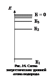 Таким образом, схема энергетических уровней атома водорода будет иметь вид, изображенный на рис. 14. Согласно формуле (18) при переходе электрона из одного энергического состояния в другое испускается квант электромагнитной волны с энергией:
