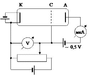 Согласно постулатам Бора уровни энергий внутри атома должны принимать дискретные значения. Изучая методом задерживающего потенциала столкновения электронов с атомами газов, в 1913 году Д.Франк и Г.Герц экспериментально доказали дискретность значений энергии атомов. Принципиальная схема установки Франка и Герца приведена на рис.15. В трубке находились пары ртути при низком давлении (порядка