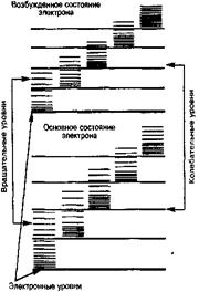 где Каждая из входящих в выражение (13.1) энергий квантуется (ей соответствует набор дискретных уровней энергии) и определяется квантовыми числами. При переходе из одного энергетического состояния в другое поглощается или испускается энергия D E=hv. При таких переходах одновременно изменяются энергия движения электронов, энергии колебаний и вращения. Из теории и эксперимента следует, что расстояние между вращательными уровнями энергии D Строение молекул и свойства их энергетических уровней проявляются в молекулярных спектрах – спектрах излучения (поглощения), возникающих при квантовых переходах между уровнями энергии молекул. Спектр излучения молекулы определяется структурой ее энергетических уровней и соответствующими правилами отбора. Итак, при разных типах переходов между уровнями возникают различные типы молекулярных спектров. Частоты спектральных линий, испускаемых молекулами, могут соответствовать переходам с одного электронного уровня на другой ( электронные спектры)или с одного колебательного (вращательного) уровня на другой (колебательные (вращательные) спектры).Кроме того, возможны и переходы с одними значениями Типичные молекулярные спектры – полосатые, представляющие собой совокупность более или менее узких полос в ультрафиолетовой, видимой и инфракрасной областях. Применяя спектральные приборы высокой разрешающей способности, можно видеть, что полосы представляют собой настолько тесно расположенные линии, что они с трудом разрешаются. Структура молекулярных спектров различна для разных молекул и с увеличением числа атомов в молекуле усложняется (наблюдаются лишь сплошные широкие полосы). Колебательными и вращательными спектрами обладают только многоатомные молекулы, а двухатомные их не имеют. Это объясняется тем, что двухатомные молекулы не имеют дипольных моментов (при колебательных и вращательных переходах отсутствует изменение дипольного момента, что является необходимым условием отличия от нуля вероятности перехода). Молекулярные спектры применяются для исследования строения и свойств молекул, используются в молекулярном спектральном анализе, лазерной спектроскопии, квантовой электронике и т.д. Date: 2015-05-19; view: 599; Нарушение авторских прав |