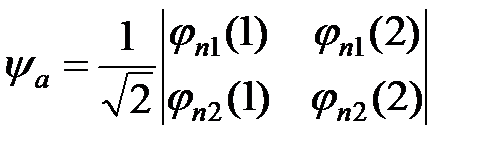 которая отличается от функции (1) перестановкой координат пары частиц относительно квантовых состояний n 1 и n 2. Из принципа тождественности одинаковых частиц следует, что из функции (1) и (2) необходимо «сконструировать» линейные комбинации, обладающие требуемым свойством симметрии относительно перестановки координат пары частиц. Для системы двух слабосвязанных фермионов, волновая функция системы должна быть антисимметричной