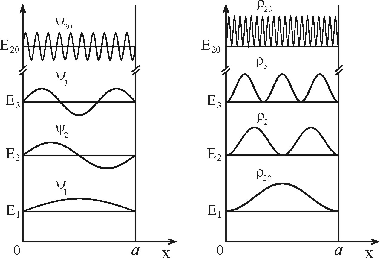 Важнейшими примерами движения частиц в потенциальных ямах является движение нуклонов в ядрах, электронов в атомах и молекулах. Основные закономерности финитного движения частиц можно исследовать на примере, когда форма потенциального рельефа имеет вид прямоугольной бесконечно глубокой ямы шириной а. На интервале (0, а) потенциальную энергию примем равной нулю, а вне этого интервала она обращается в бесконечность (Рис. 2.1). Вследствие этого частица при своём движении не может выйти за пределы отрезка (0, а) или, как говорят, частица находится в бесконечно глубокой потенциальной яме шириной а.