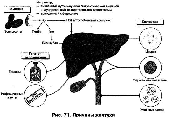 Врожденные нарушения транспорта билирубина приводят к желтухе из-за несовершенного поглощения, сниженой конъюгации или ослабленного выведения билирубина. Генерализованная гепатоцеллюлярная дисфункция может иметь место при гепатитах и декомпенсированных печеночных циррозах. Патогенез желтухи в этих случаях сложен, свой вклад вносят нарушения захвата, внутриклеточного транспорта, сниженная конъюгация билирубина. Лекарственные вещества могут вызывать гепатоцеллюлярные повреждения в связи со своей дозозависимой гепатотоксичностью (например, парацетамол) или идиосинкратической чувствительностью (например, изониазид). Если гипербилирубинемия вызвана нарушением конъюгации, билирубин не конъюгируется и отсутствует усиление потока билирубина через печень. Следствеием этого является то, что отсутсвует билурубинурия и уровень уробилиногена в моче не повышен. При наличии генерализованной дисфункции захват билирубина печенью снижается и, следовательно, большее его количесто экскретируется почками. Билирубин в сыворотке может быть конъюгированным и неконъюгированным, так как могут быть дефектными УДФ-глюкоронилтрансфераза и внутриклеточный транспорт билирубина. Если скорость конъюгации превышает экскреторную способность, в крови повышается уровень конъюгированного билирубина и он может экскретироваться с мочой. Такое иногда случается при выздоровлении после вирусного гепатита.